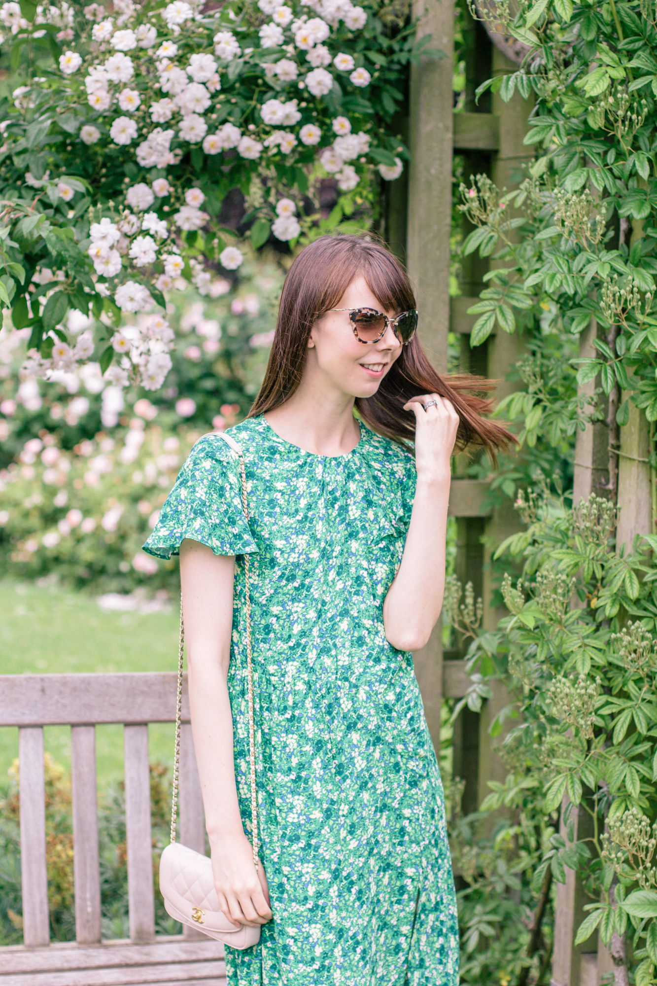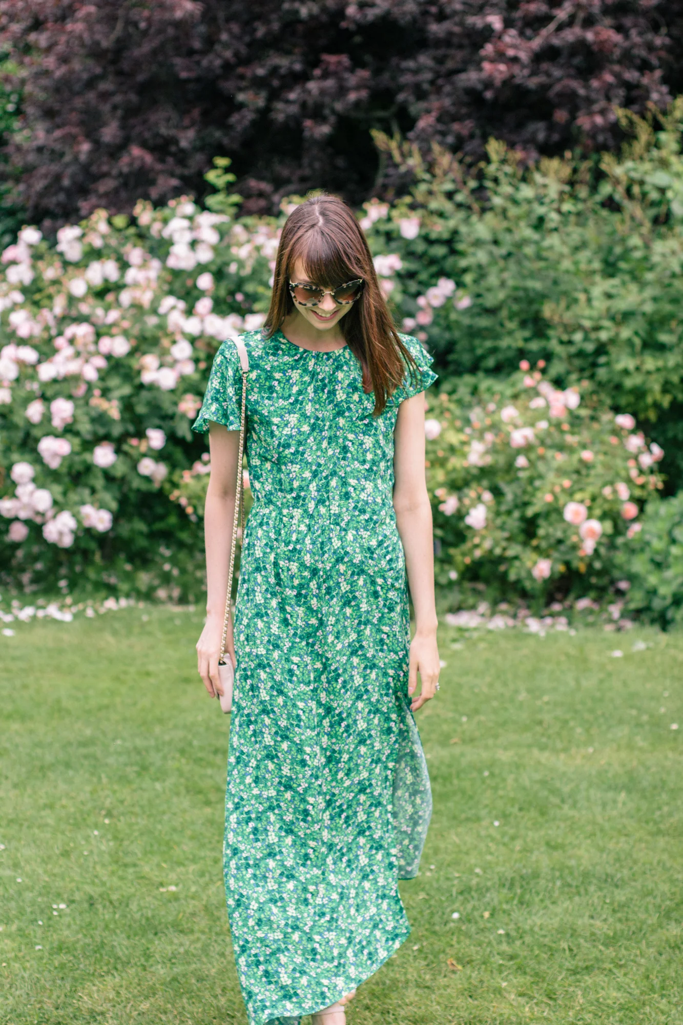 The dainty pink and green pattern of this dress looks like dappled light hitting the roses in some impressionist painting. This sort of pattern is called a ditsy print, but frankly, dappled sounds a little more elevated, doesn't it?